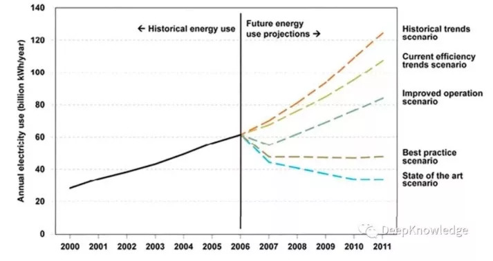 ? ? ? 美國國會甚至也參與進來。這表明國家領(lǐng)導(dǎo)人們已經(jīng)關(guān)注到數(shù)據(jù)中心和他們的能源能耗量。國會指示美國環(huán)境保護署(EPA)提交一份關(guān)于數(shù)據(jù)中心能源消耗的報告(公法編號109-341,譯者注:實際為109-431)。這項法律另外還指示美國環(huán)境保護署(EPA)確定能效提升策略并推動相關(guān)市場。據(jù)該報告預(yù)計,除非采取能顯著提高能效的措施,否則數(shù)據(jù)中心將會大幅度增加能源消耗量(見圖2)。