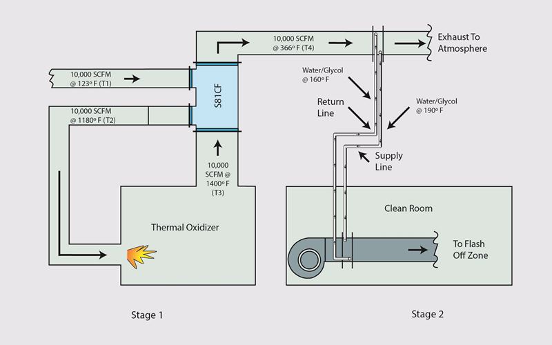 廢氣流中的水盤(pán)使用熱交換器出來(lái)365℉的空氣將水 - 乙二醇混合物從160℉加熱到190℉。然后水流到工廠的潔凈室,在這里強(qiáng)制風(fēng)扇將環(huán)境空氣吹過(guò)第二個(gè)線圈,將空氣從70℉加熱到180℉。這種熱空氣進(jìn)入閃蒸區(qū),在那里它可以固化應(yīng)用于鏡片的透明涂層和溶劑。