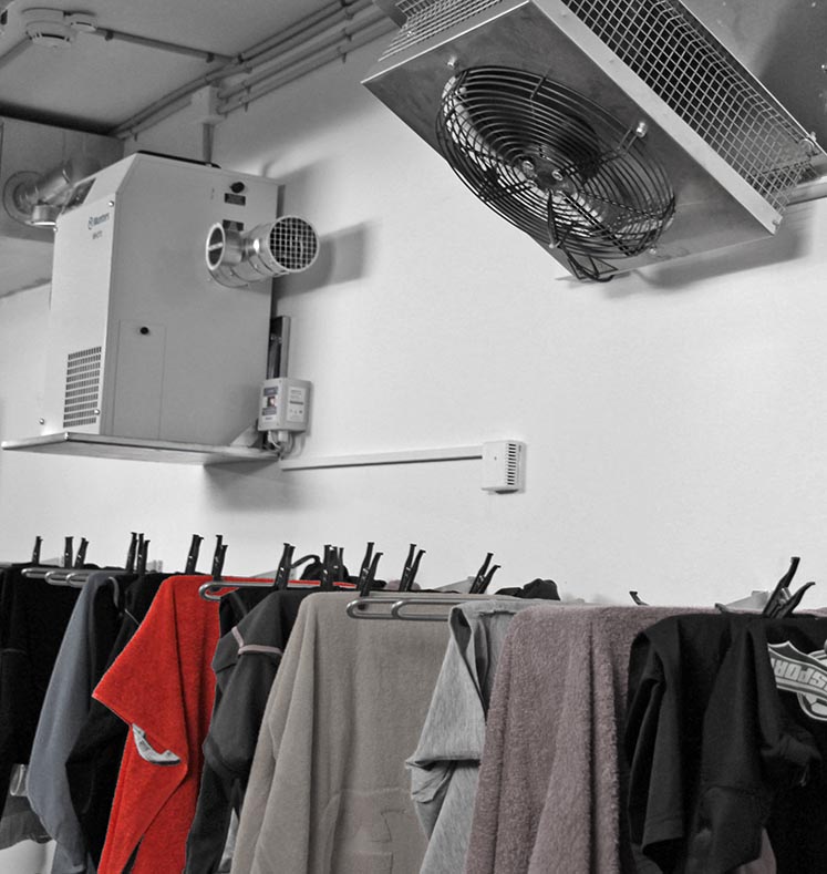早上第一位使用的員工啟動干衣間三個循環(huán)風機開關后,掛上衣服、鞋子和毛巾。這不僅可確保衣服中的水分被排放到室外空氣中,同時除濕機提供的干燥空氣可有效均勻地分布在整個房間中。當室內(nèi)的相對濕度高于45%時,除濕機自動會開始除濕。